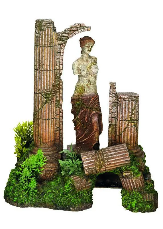 Ornament pentru acvariu în formă de coloană antică și zeiță cu plante, având un design atrăgător pentru a îmbunătăți estetica acvatică.