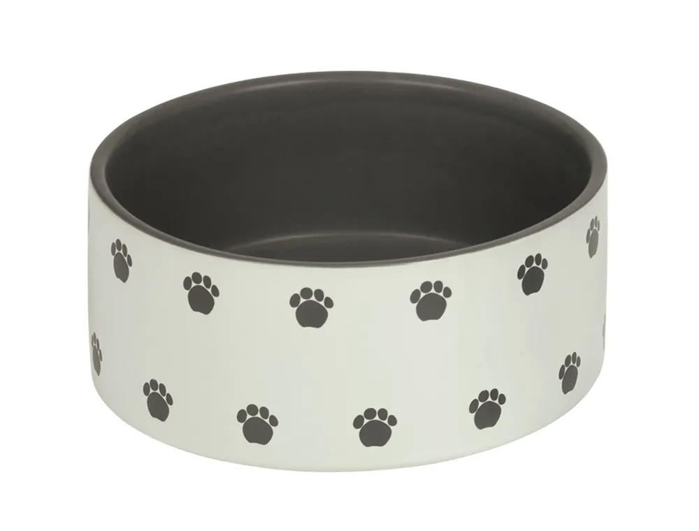 Castron din ceramică 'HUNGRY', cu un design elegant în nuanțe crem și gri, ideal pentru câini de dimensiuni medii. Diametrul de 18 cm și înălțimea de 7 cm îl fac perfect pentru servirea hranei sau apei.