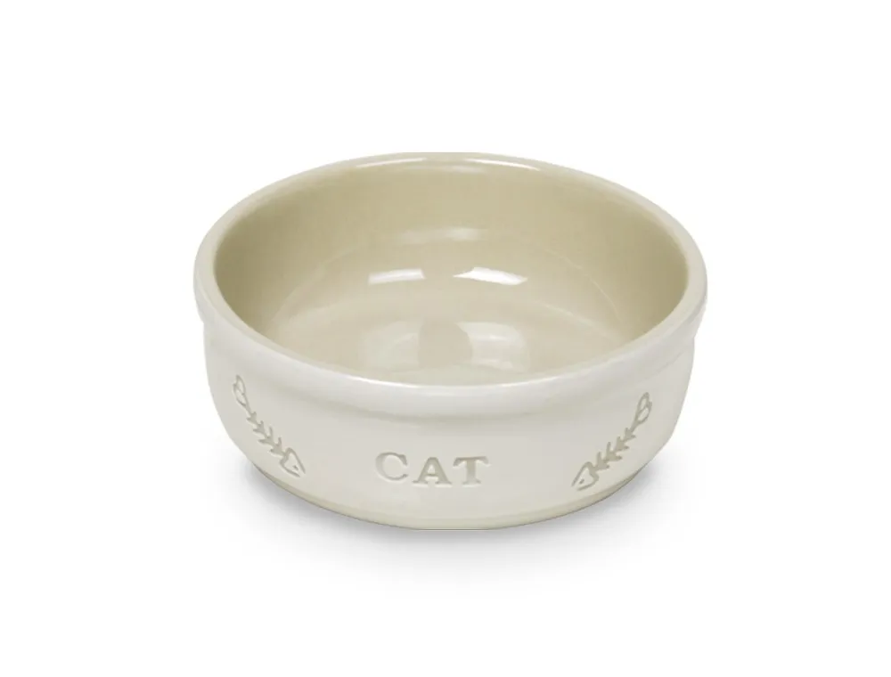 Bol din ceramică 'CAT' alb și bej, cu diametru de 13,5 cm și adâncime de 5 cm. O opțiune elegantă pentru mesele pisicii tale.