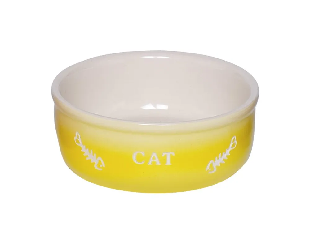 Castron din ceramică pentru pisici, model 'Gradient' în nuanță galbenă, cu dimensiuni de 13,5 cm diametru și 4,5 cm adâncime, având o capacitate de 0,25 l. Ideal pentru a adăuga un accent colorat în zona de masă a pisicii.