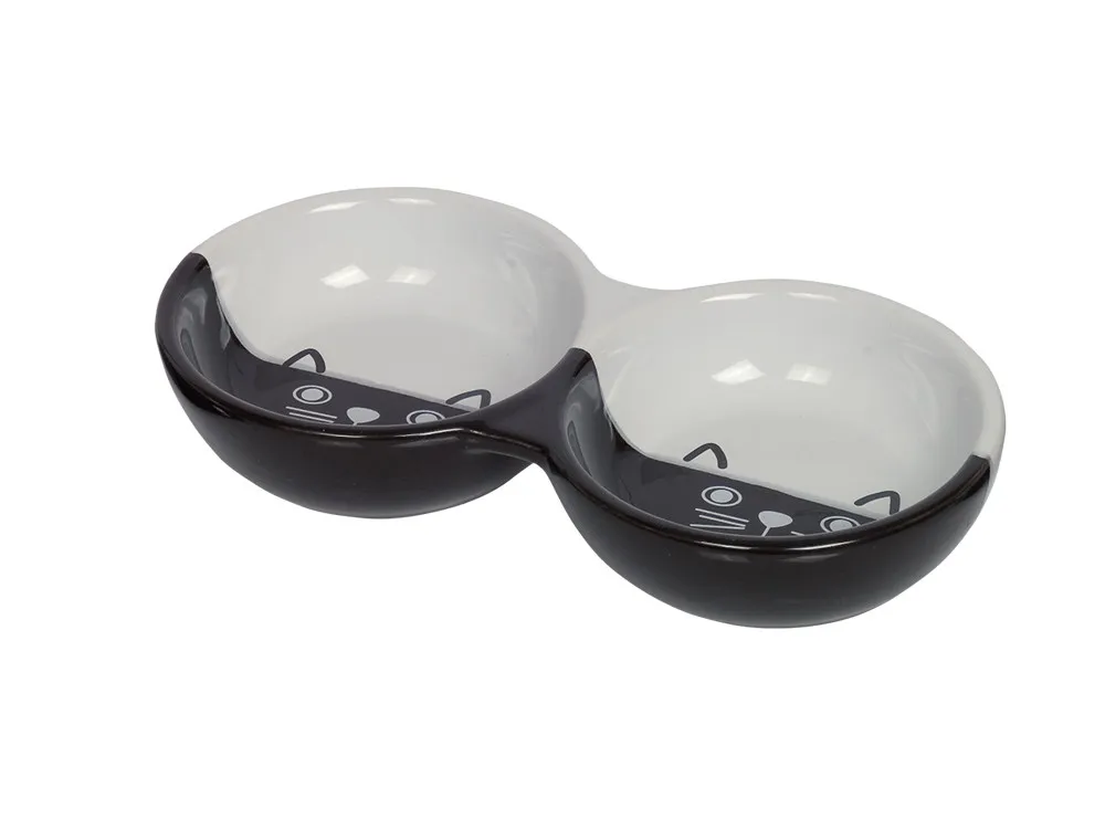 Castron dublu din ceramică 'FACE', negru și alb, cu dimensiuni de 22 x 11,5 x 3,5 cm. Perfect pentru a oferi mâncare și apă pisicii tale.