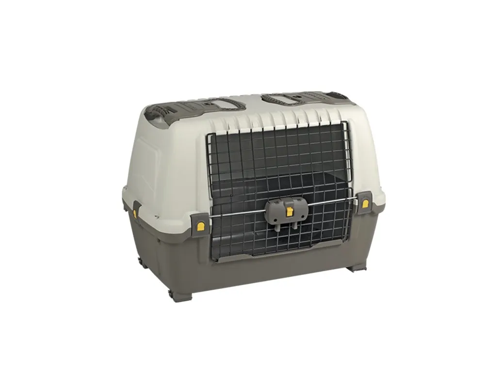 Cusca pentru masina 'SKUDO CAR 80' este gri si are dimensiunile de 77 x 43 x 51 cm, fiind special conceputa pentru transportul in siguranta al cainelui pe drumuri.