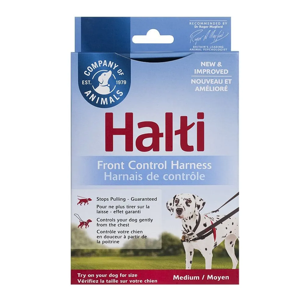Ham pentru câini 'HALTI', dimensiune M, conceput pentru câini de talie medie. Fabricat din materiale rezistente, oferă confort și suport în timpul plimbărilor.