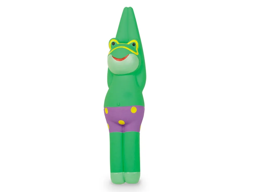 Jucăria din latex 'Broască scafandru' pentru câini măsoară 28 cm și este realizată din latex durabil. Este ideală pentru mușcat și joacă, având un design atrăgător care va capta atenția câinelui tău.