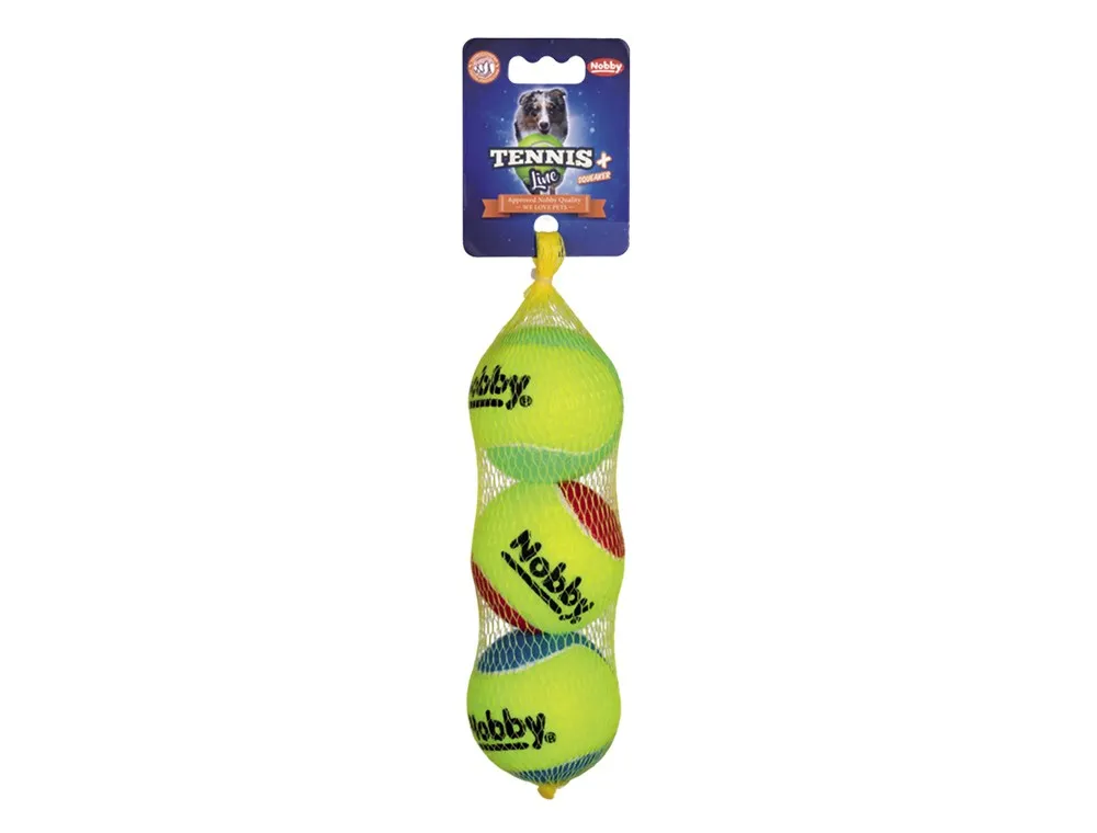 Setul conține 3 mingi de tenis cu sunet, de dimensiune medie (Ø 6,5 cm), asortate. Aceste mingi sunt ideale pentru jocul de aruncat și recuperat, fiind foarte rezistente.