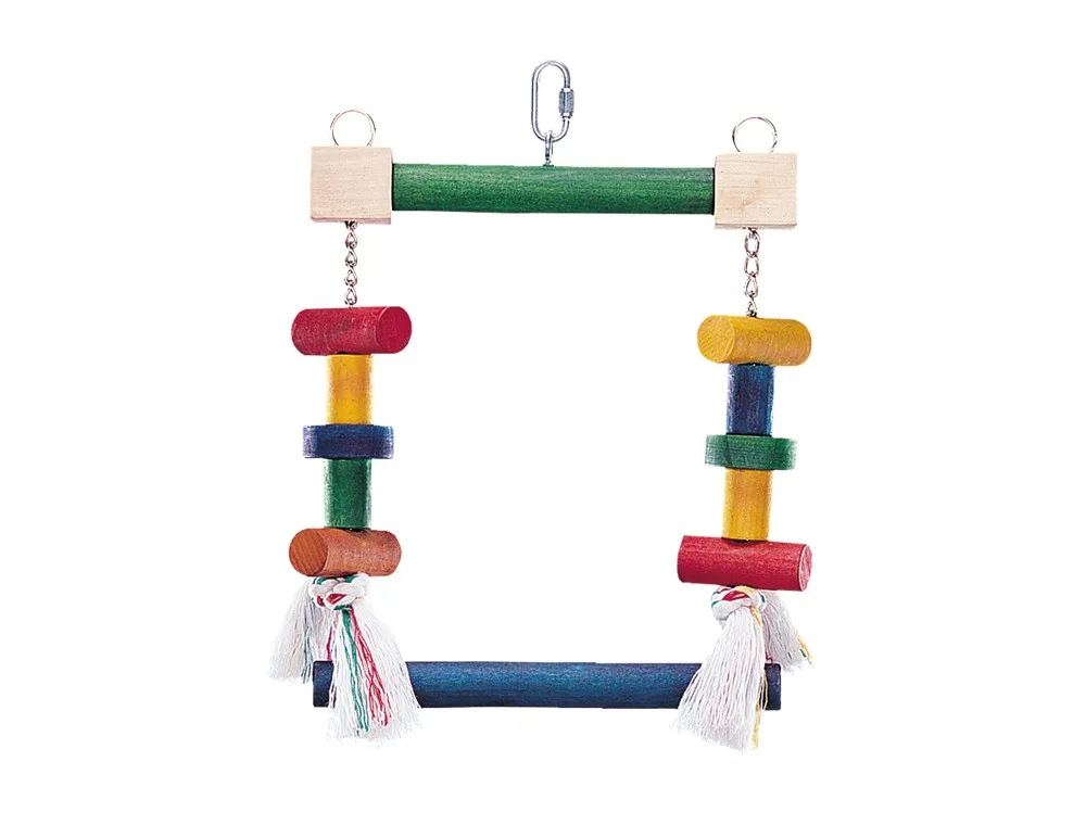 Hinta pentru păsări multicoloră, cu 14 blocuri, are dimensiuni de 23 X 21 CM. Aceasta oferă un loc perfect pentru odihnă și distracție, stimulând activitatea fizică a păsărilor tale.