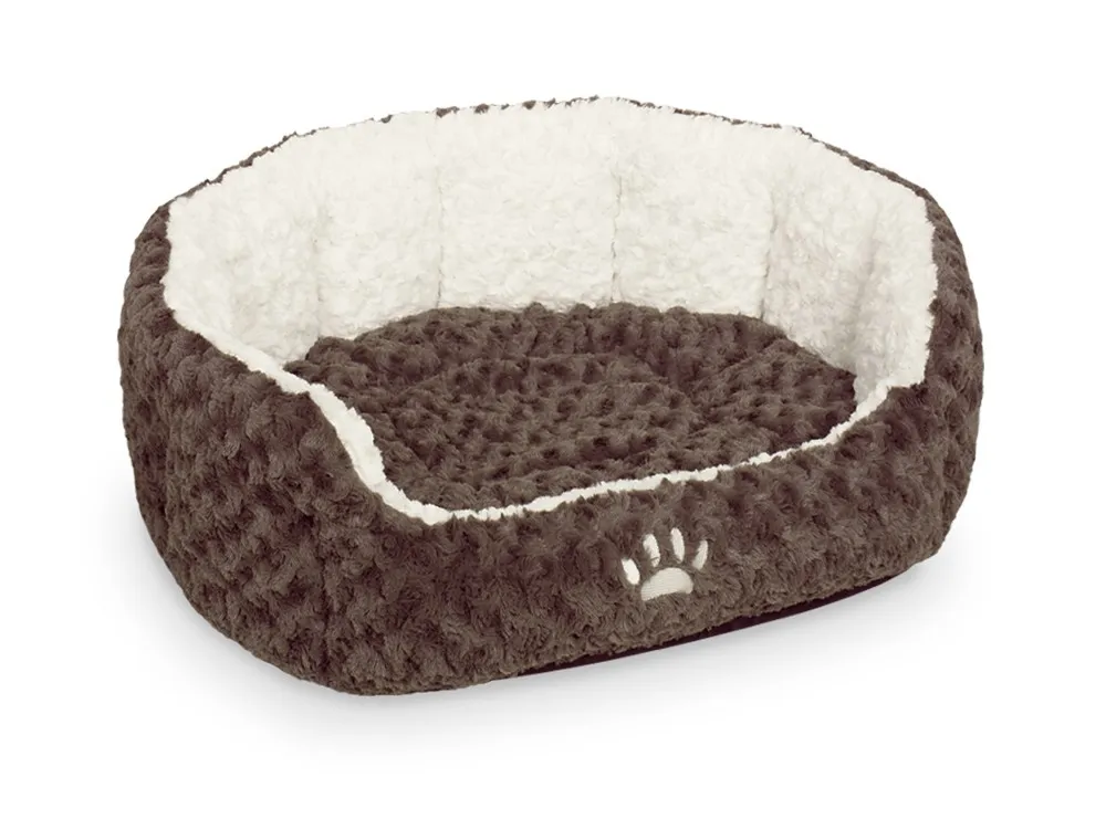 Patul oval 'NEIKU' combină nuanțele de maro și alb, având dimensiuni de 45 x 40 x 19 cm. Este perfect pentru câini de talie mică, oferind un spațiu confortabil și stilat pentru odihnă.