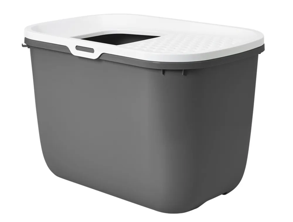 Litiera pentru pisici 'HOP IN' are un design modern in culorile antracit si alb, cu dimensiuni de 59 x 39 x 38 cm. Este usor accesibila si faciliteaza intretinerea.