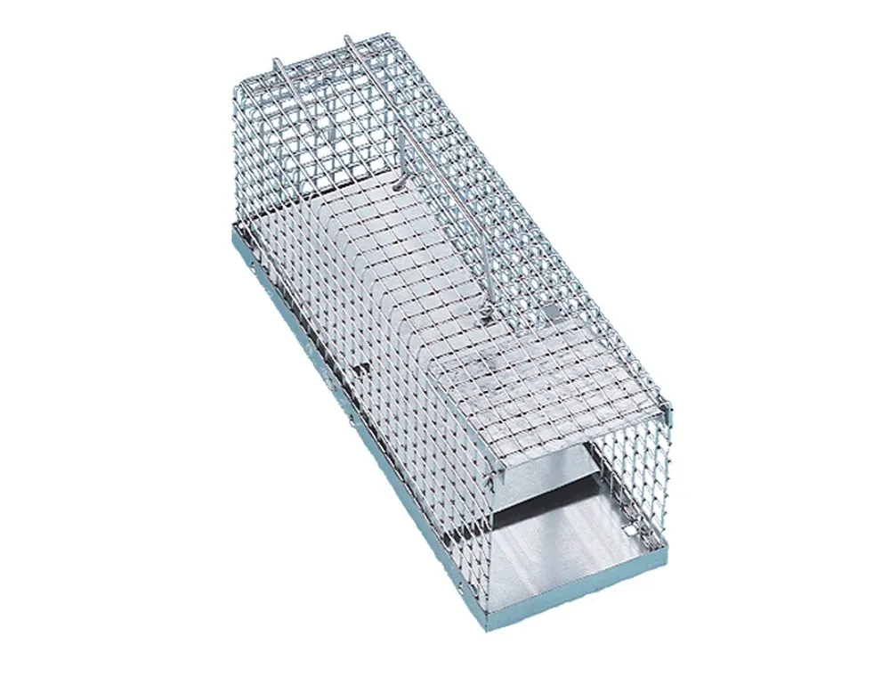 Capcană pentru șobolani, cu placă din oțel, având dimensiuni de 40 x 12 x 12 cm, este un instrument eficient pentru prinderea dăunătorilor. Designul robust asigură durabilitate și eficiență.