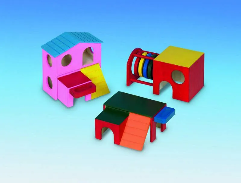 Casă din lemn pentru rozătoare cu două etaje 'Many', de culoare roz, cu dimensiunile de 15 x 16 x 15 cm. Această structură adaugă un element de distracție și explorare în cușca animalului.