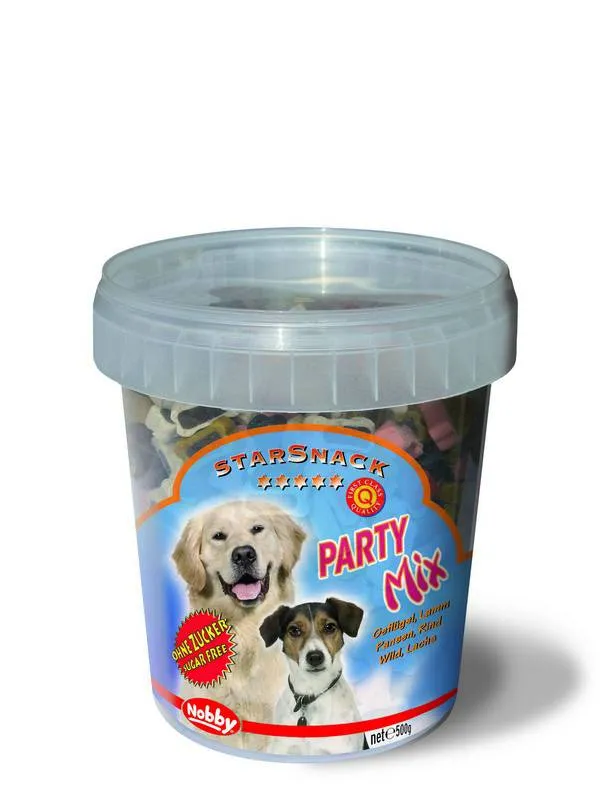 STARSNACK 'PARTY MIX' în conservă de 500 g oferă o selecție variată de gustări pentru câini, perfectă pentru ocazii speciale sau pentru a recompensa câinele într-un mod diversificat.