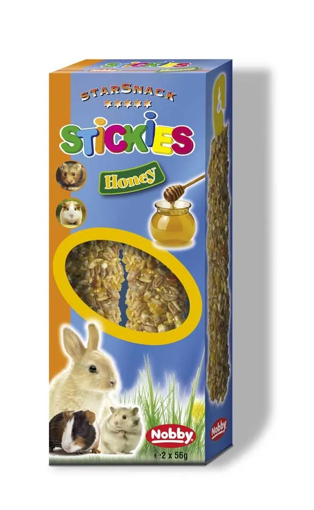 Stickies miere, set de 2 x 56 g, o delicatesă naturală pentru rozătoare. Conține ingrediente nutritive, ideale pentru a răsfăța animalele de companie.