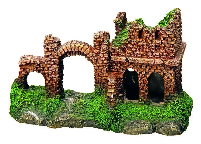 Ornamente asortate pentru acvariu, tip castel, cu dimensiuni între 9-12,5 cm. Setul conține 2 bucăți din materiale sigure pentru pești, permițându-le să se ascundă și să exploreze un mediu variat.