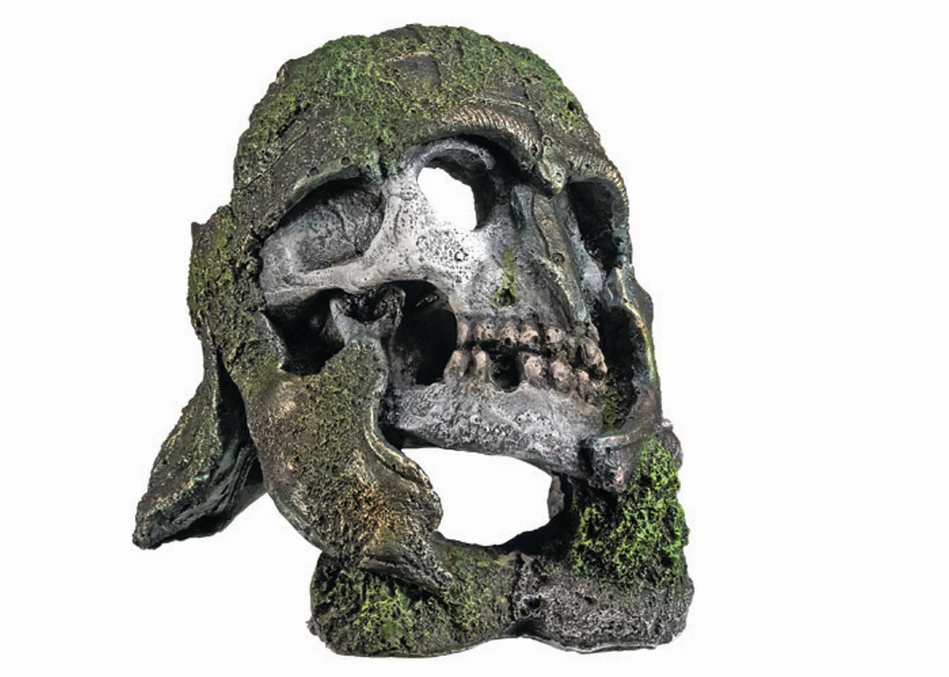 Ornamentul 'SKULL WITH HELMET' măsoară L13 x W12,5 x H11 cm și este fabricat din material plastic. Acesta adaugă un element de mister și aventură în acvariu, oferind peștilor un loc interesant de explorat.