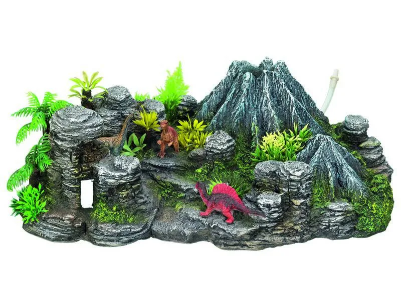 Ornament pentru acvariu | 'VOLCANO WITH DINOSAURS' - cu plante | L33 X W