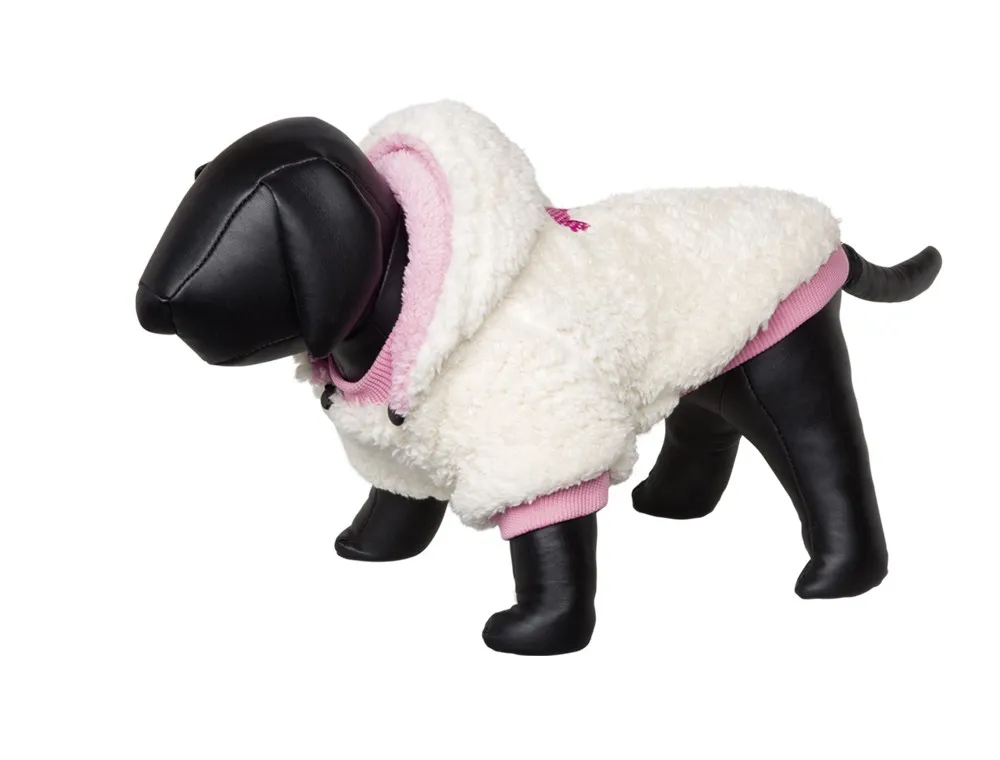 Haina 'TEDDY' pentru câini, în nuanțe de crem și pink, cu lungimea de 20 cm, oferă un stil adorabil și este realizată dintr-un material confortabil, ideal pentru zilele răcoroase.