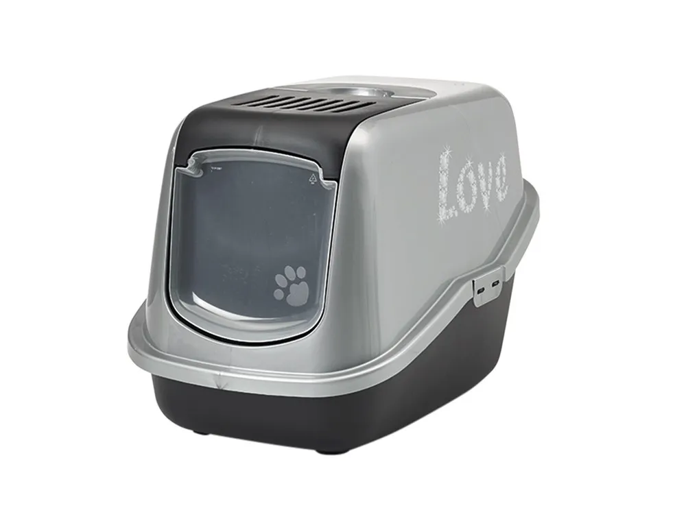 Litiera pentru pisici 'NESTOR' Impression 'LOVE', cu dimensiuni de 56 x 39 x 38,5 cm, este disponibilă în culorile negru și argintiu. Este un model modern și elegant, ușor de utilizat și curățat.